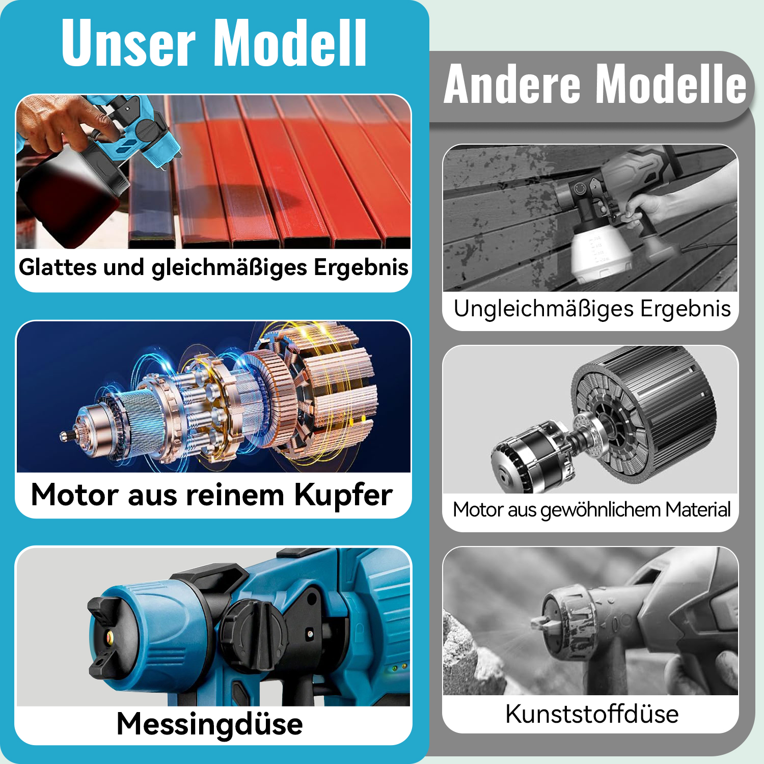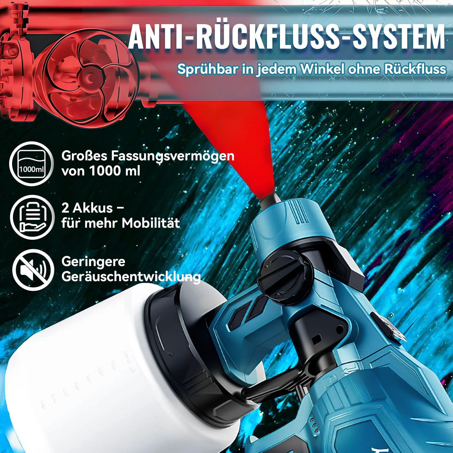 Die Norevia Farbspritzpistole überzeugt mit starker Leistung und einem großen 1000-ml-Behälter. Der verbesserte Motor verfügt über eine temperaturgeschützte Sicherung, die Betriebsgeräusche reduziert, die Lebensdauer verlängert und gleichzeitig die Effizienz steigert.