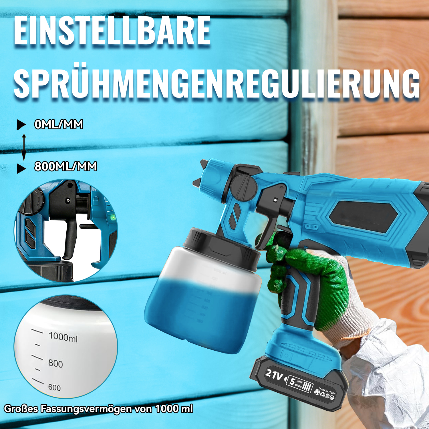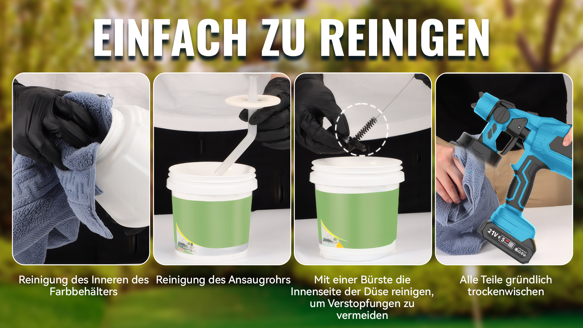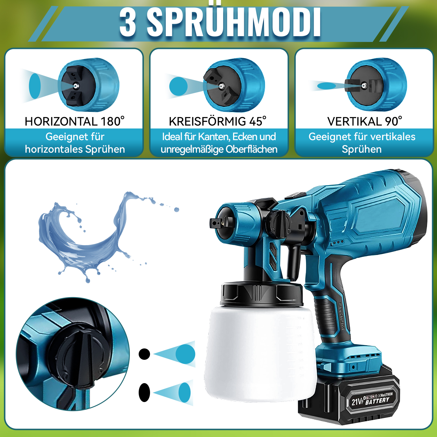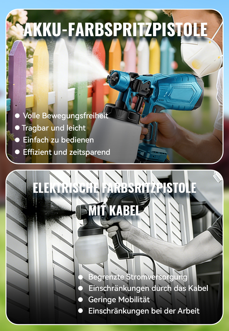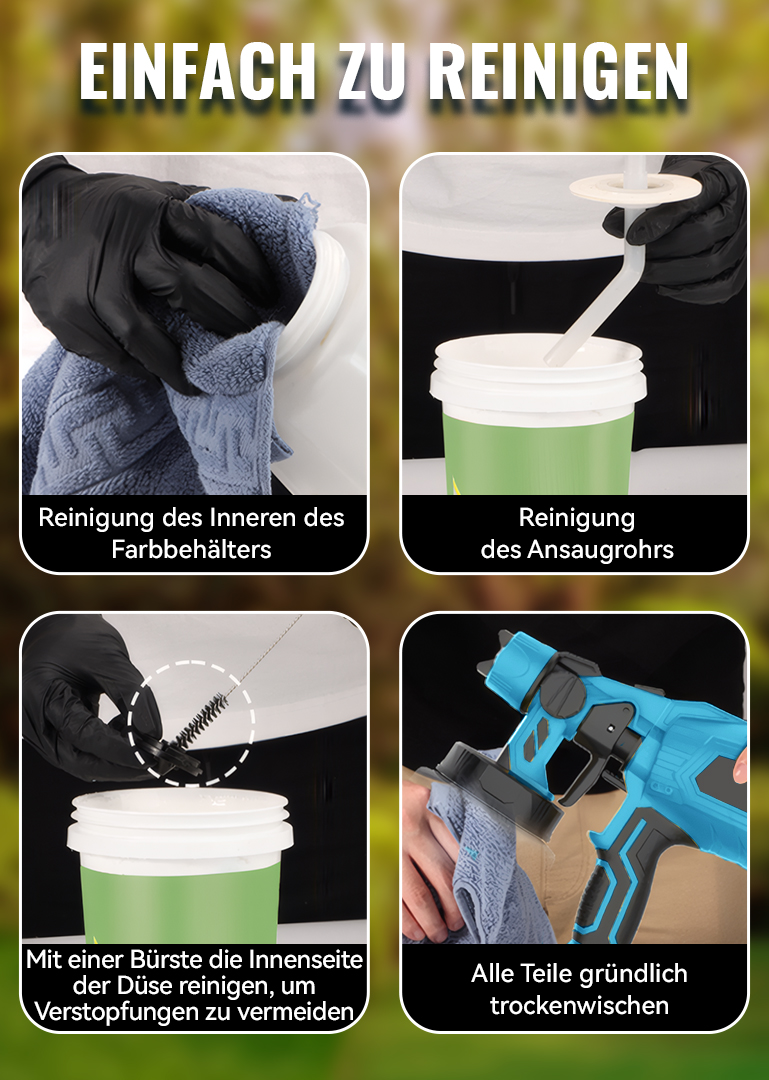Die akkubetriebene Farbspritzpistole bietet drei verschiedene Sprühmuster: horizontal, vertikal und rund. Dadurch ist sie für unterschiedliche Anwendungen geeignet. Nach dem Sprühen sollten Düse und Farbbehälter rechtzeitig gereinigt werden, um Verstopfungen zu vermeiden.