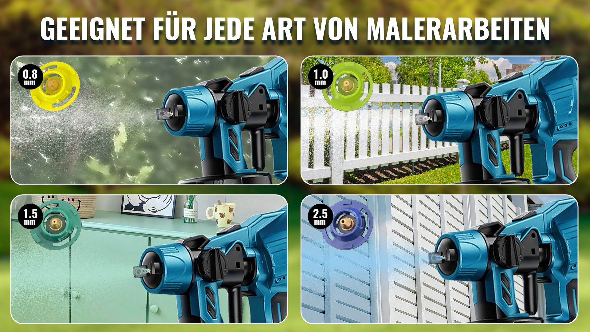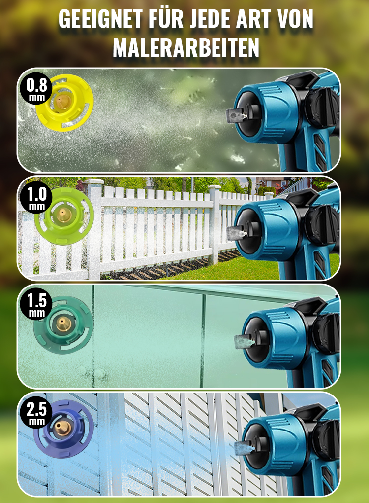 Die Farbspritzpistole ist mit 4 Düsen ausgestattet (Größen: 0,8 mm, 1,0 mm, 1,5 mm und 2,5 mm). Kleinere Düsen eignen sich für präzise Feinarbeiten, während größere Düsen ideal für das Beschichten größerer Flächen sind.