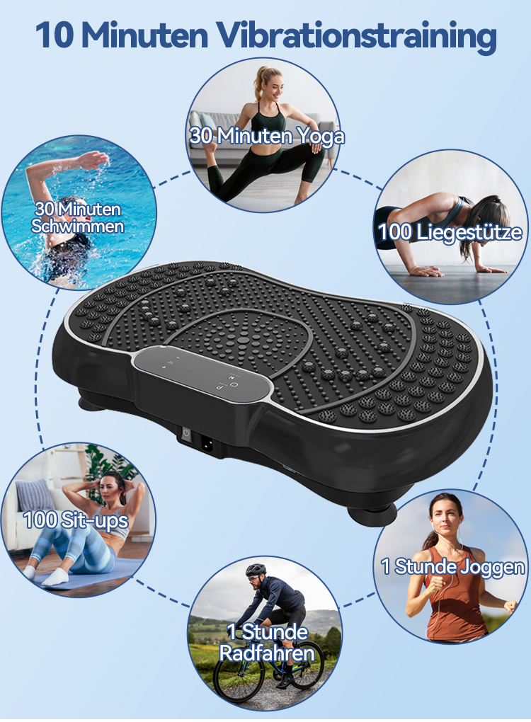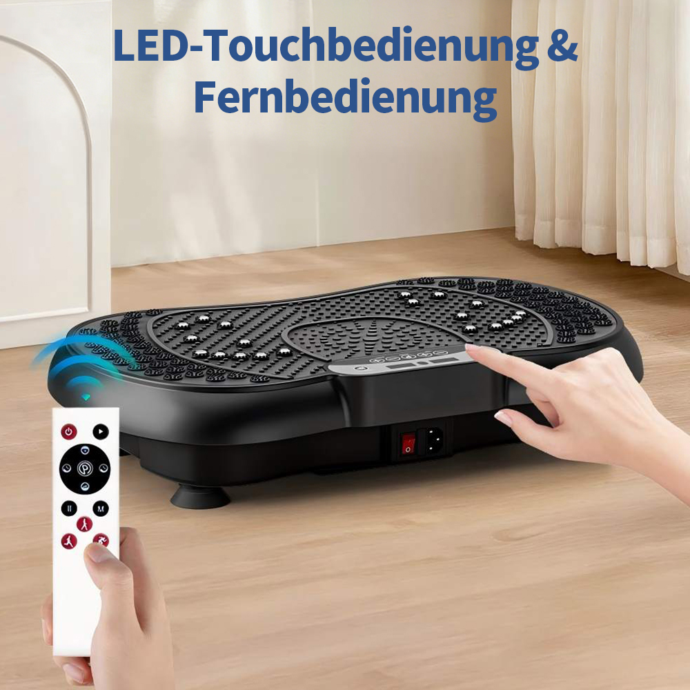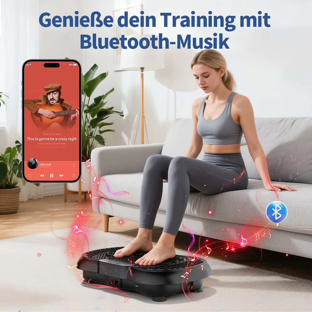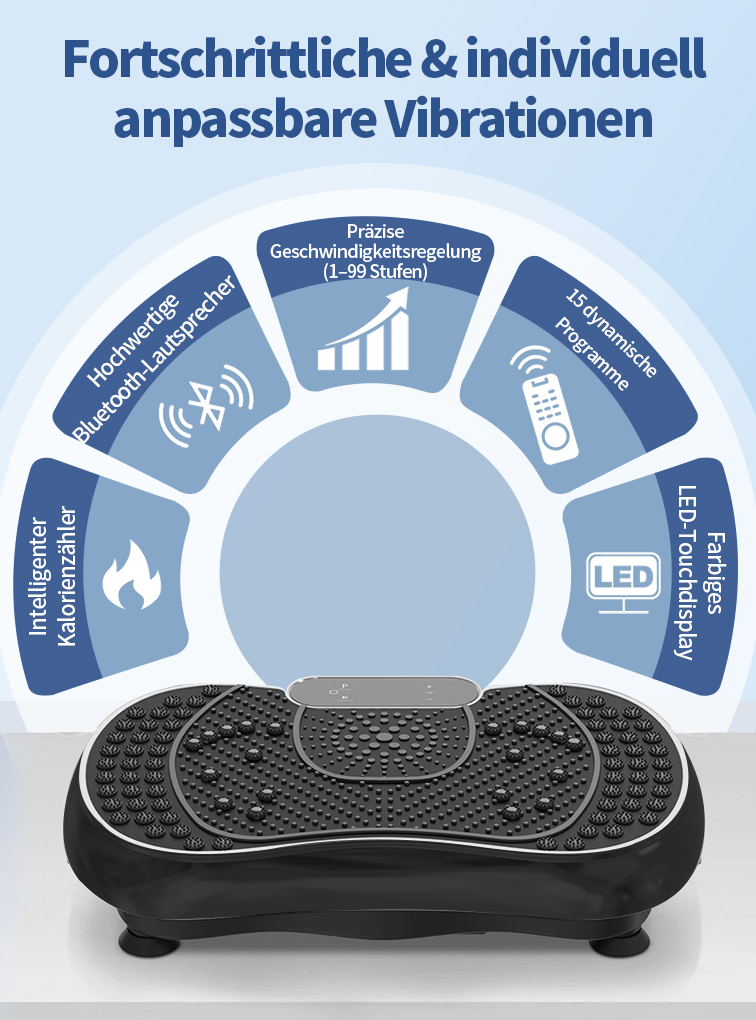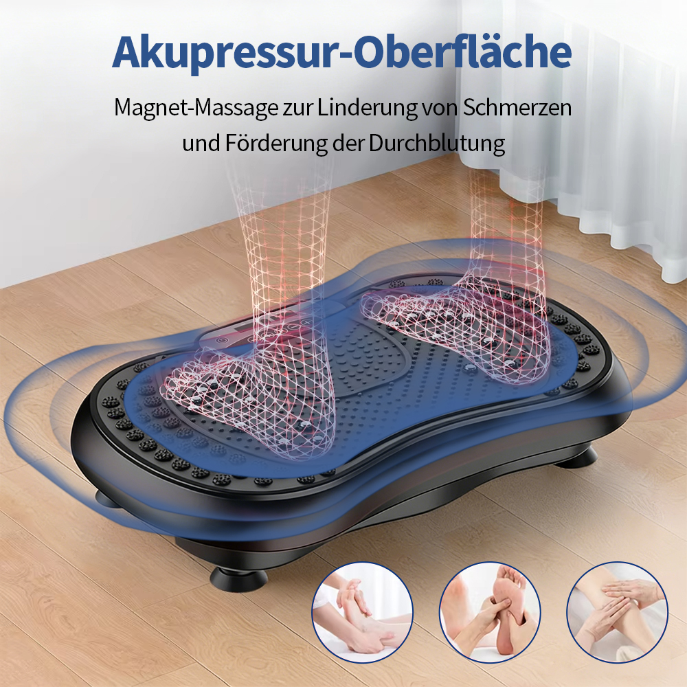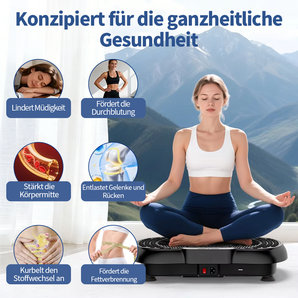 Diese Vibrationsplatte wurde so konzipiert, dass mehrere Muskelgruppen gleichzeitig aktiviert werden können und ein kontrolliertes, gelenkschonendes Ganzkörpertraining unterstützt wird.