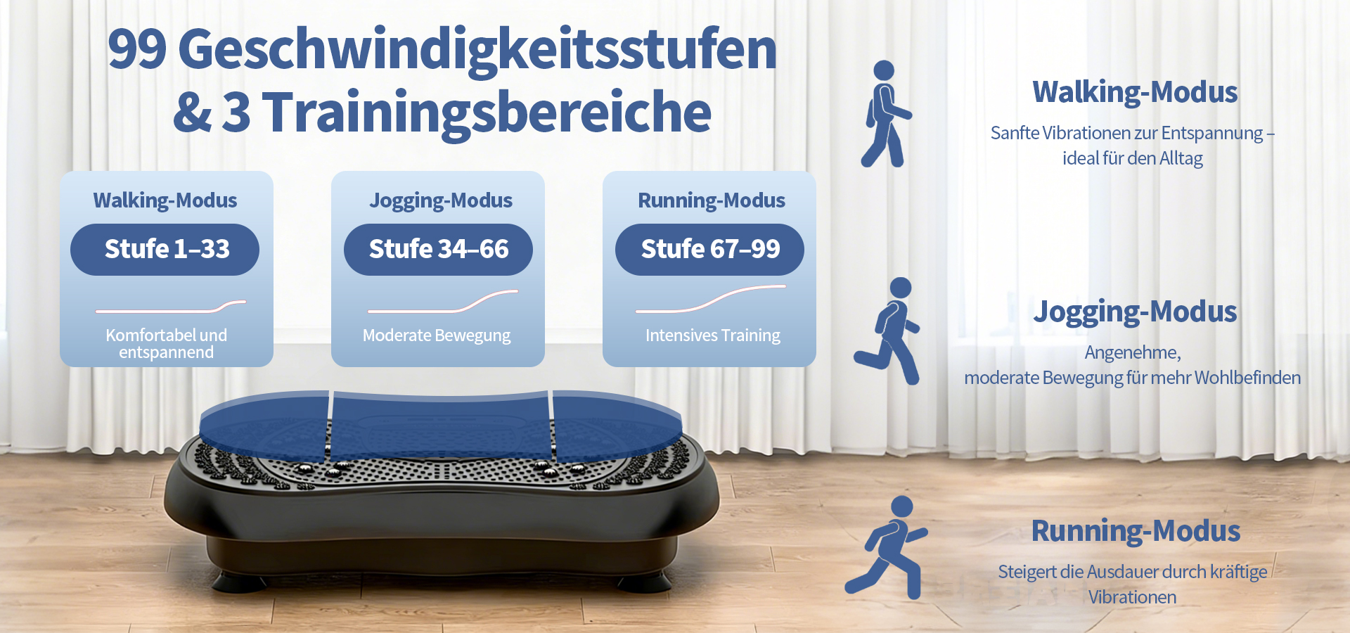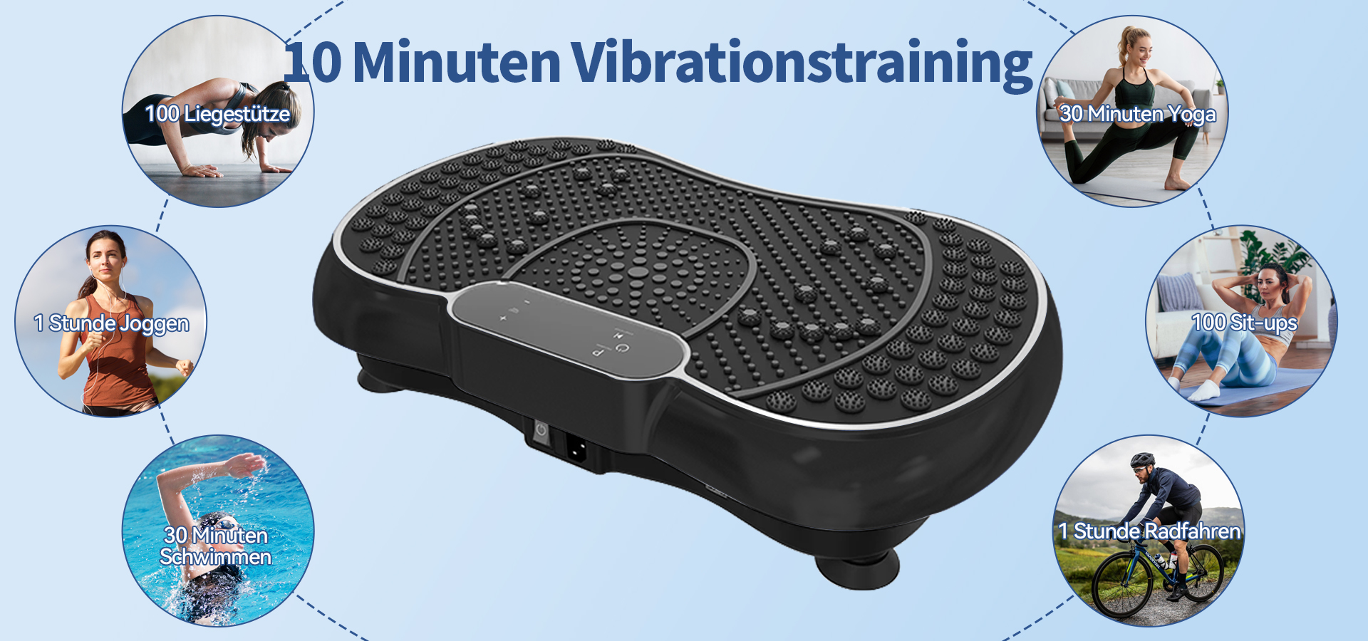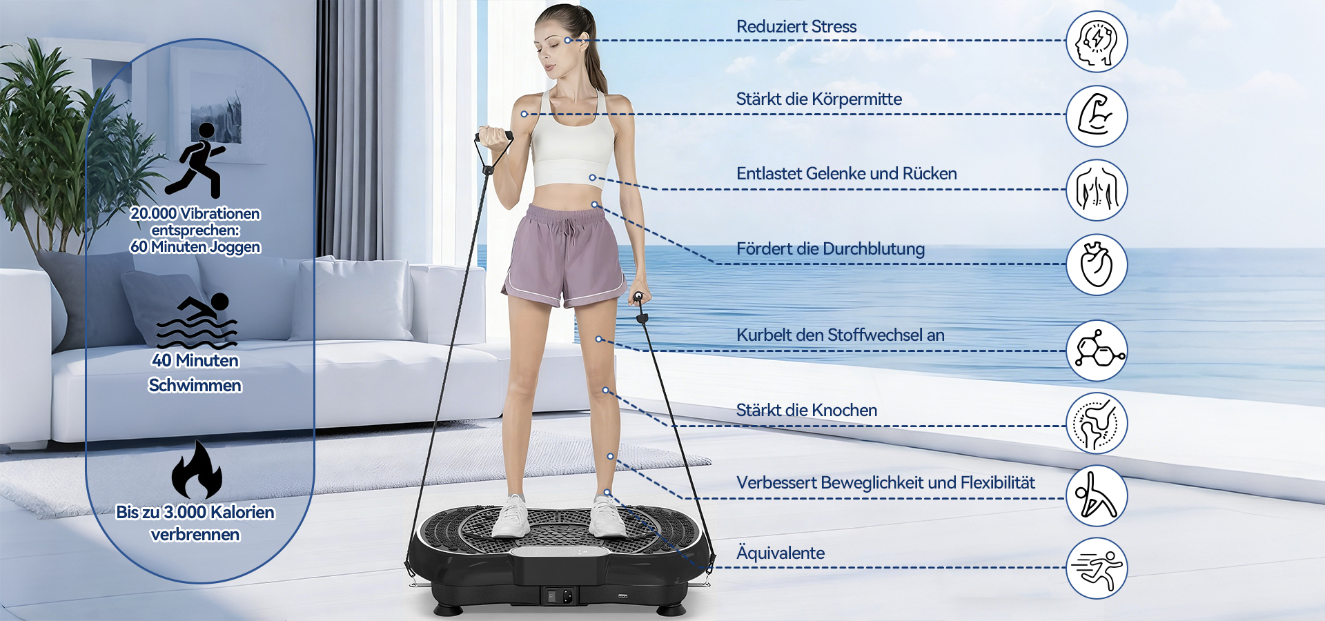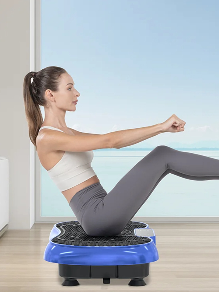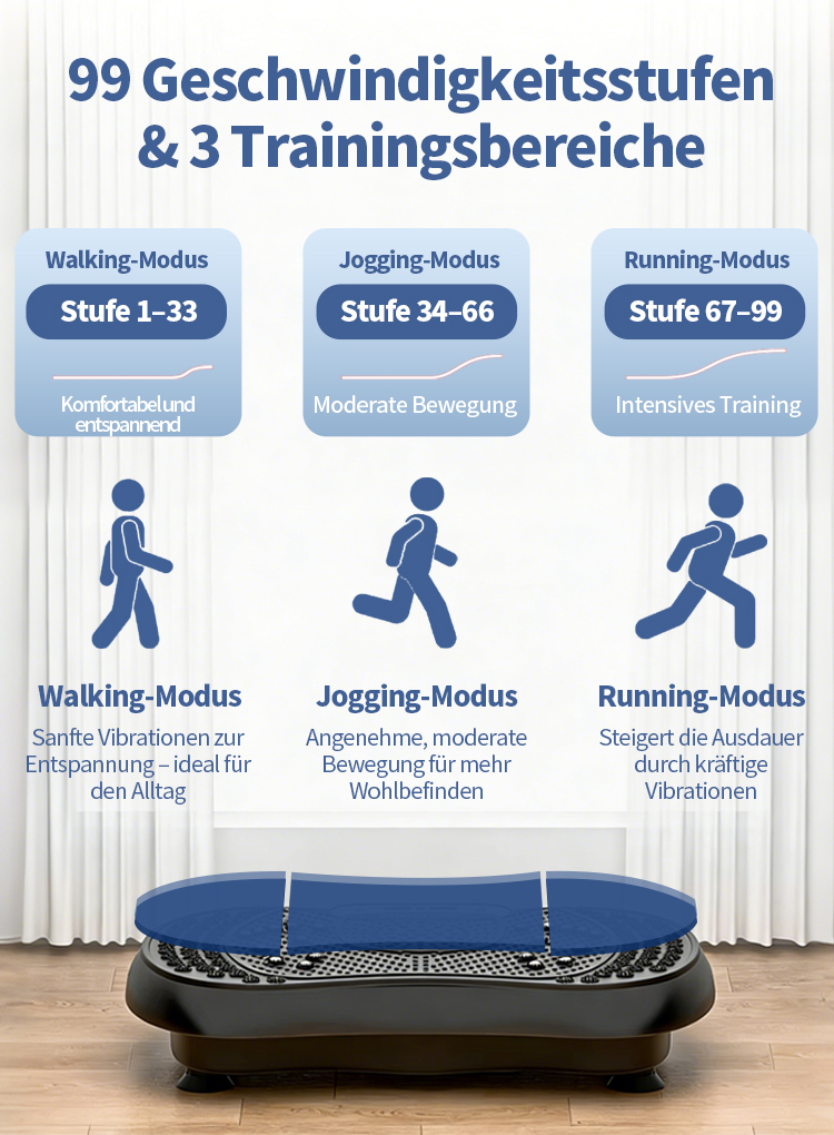 Diese Vibrationsplatte wurde so konzipiert, dass mehrere Muskelgruppen gleichzeitig aktiviert werden können und ein kontrolliertes, gelenkschonendes Ganzkörpertraining unterstützt wird.
